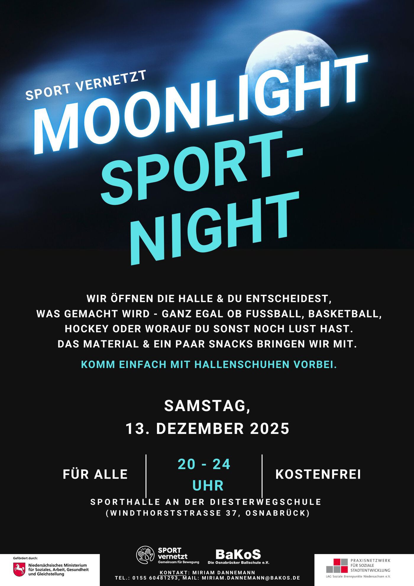 Am 13. Dezember 2025 öffnen wir von 20 bis 24 Uhr die Sporthalle an der Diesterwegschule (Windthorststraße 37, Osnabrück) für alle, die Lust auf Bewegung, Spiel und gute Stimmung haben!